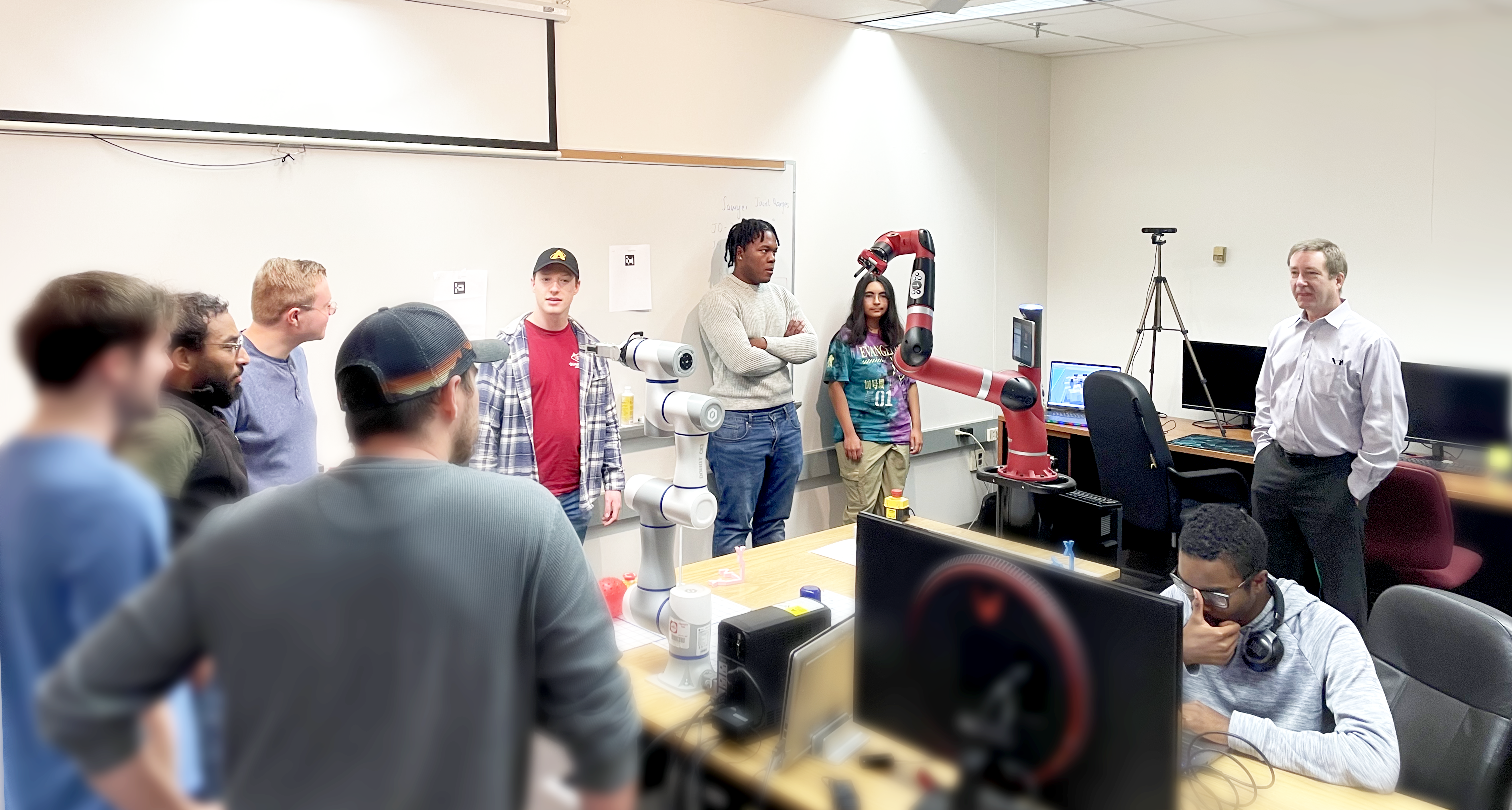 This is a digital twin of the robotics lab at University of Maryland, Baltimore County. It is being used to support robotic arms (cobots) controls research and engineering education. More details can be found here: https://tsehuaiwu.umbc.edu/